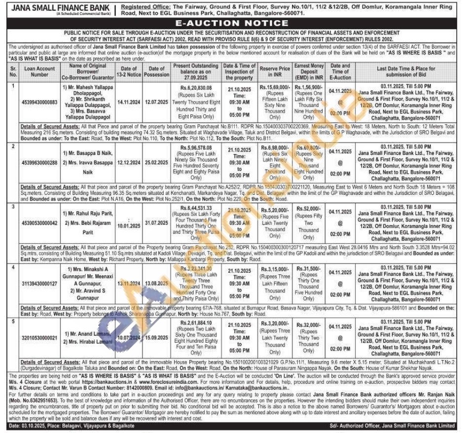 Details of Secured Assets: All that piece and parcel of the immovable House Property bearing No. 150100200100321029 G.P.No.11/1, Measuring 9.6 meter X 5.15 meter, Situated at Muchakhandi L.T.No.2 (Durgadevinagar) of Bagalkote Taluka and Bounded on: On the East: Road, On the West: Road, On the North: House of Parasuram Ningappa Nayak, On the South: House of Kumar Shekhar Nayak.