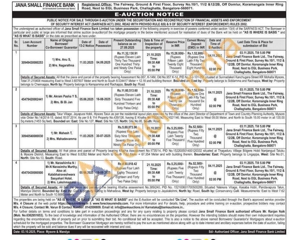 Details of Secured Assets: All that the piece and parcel of the bearing Khatha assessment No.389/240, PID No. 152100601700500289, Situated Yelekere Village, Kasaba Hobli, Pandavapura Taluk, Mandya District, Bounded by: East by: Galli & property belong to Mahadeva, West by: Property belongs to Jayalakshmi, North by: Road, South by: Conservancy Galli. Measurements: East to West 7.62 Meter and North to South 10.6680 meters
