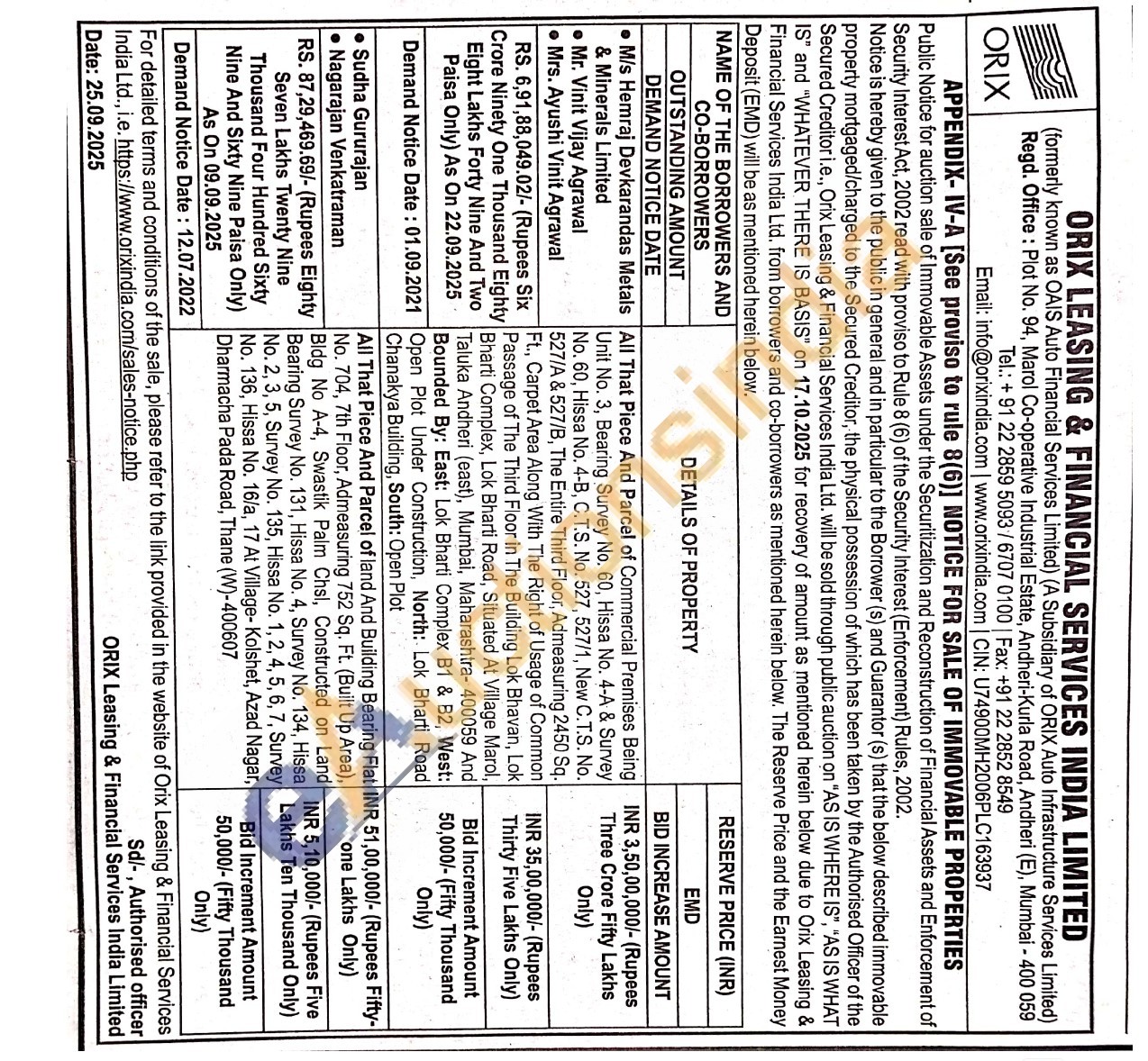 All That Piece And Parcel of land And Building Bearing Flat No. 704, 7th Floor, Admeasuring 752 Sq. Ft. (Built Up Area), Bldg No A-4, Swastik Palm Chsl, Constructed on Land Bearing Survey No. 131, Hissa No. 4, Survey No. 134, Hissa No. 2, 3, 5, Survey No. 135, Hissa No. 1, 2, 4, 5, 6, 7, Survey No. 136, Hissa No. 16/a, 17 At Village- Kolshet, Azad Nagar, Dharmacha Pada Road, Thane (W)-400607