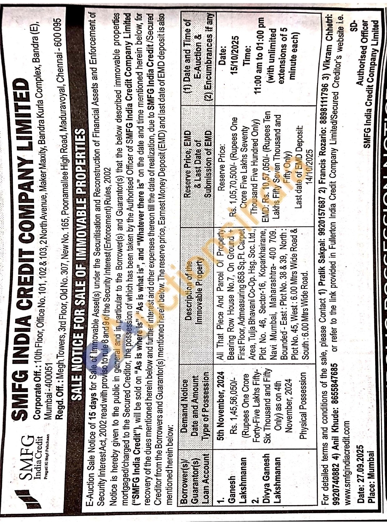 All That Piece And Parcel Of Property Bearing Row House No.7, On Ground + First Floor, Admeasuring 858 Sq. Ft. Carpet Area, Tulja Bhavani Co-Op. Hsg. Soc. Ltd., Plot No. 46, Sector-16, Koparkhairane, Navi Mumbai, Maharashtra- 400 709. Bounded - East: Plot No. 38 & 39, North: Plot No. 45, West: 6.00 Mtrs Wide Road & South: 6.00 Mtrs Wide Road.