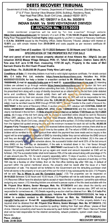 Part and parcel of land and house property situated at Arazi Khasra No.- 30/gh/2, (as per valuation 30/4/2) Mauza Village Sbhapur, PHN-47, Tehsil- Birsinghpur, District- Satna (M.P.) Tota area 0.41 acre 0.186 Hect. measuring 11761.00 sq.ft.; Property in the name of Shri Santosh Shukla Sio Shri Kashi Prasad Shukla