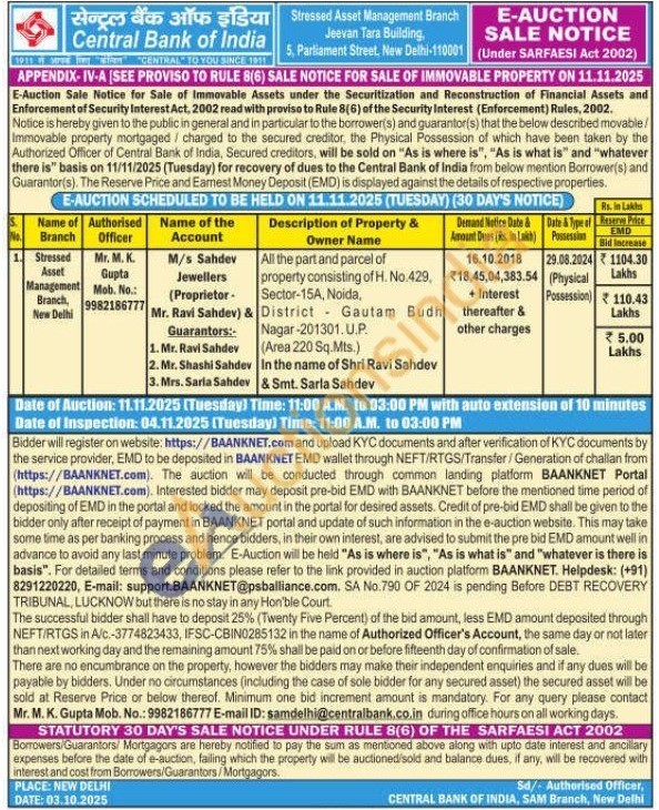 All the part and parcel of property consisting of H. No.429, Sector-15A, Noida, District (Area 220 Sq.Mts.) Gautam Budh Nagar-201301. U.P.