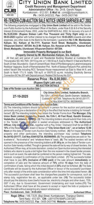 ( All that part and parcel of Land and Residential Building Situated at Cuddalore RD, Thirunavallur SD, NO.78/9-00110 sq.mtr. or 1,184.50 sq ft. East to West 51.5 feet and North to South 23 feet, Bounded to: East of Cement Road. West of Plot Belonging to Lakshminarayana Reddiyar Vagayara, South of Ramachandran Plot, North of Sadaya Padyachi Plot, admist this extent Vacant Site including RCC Terraced House measurement as East to West 44 ft. and South to North 17% ft totally 759 sq.ft. or 00070.53 sq mtr, including Electricity Service Connection SC No. 207 with Deposit amount. Related Old Survey No 53/1