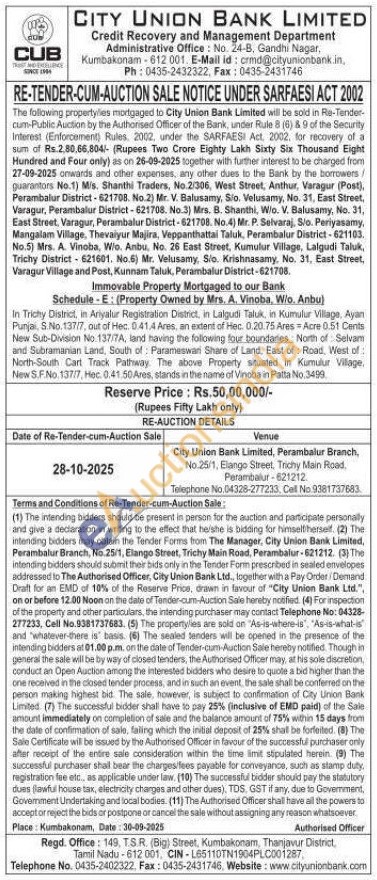 In Trichy District, in Ariyalur Registration District, in Lalgudi Taluk, in Kumulur Village, Ayan Punjai, S.No. 137/7, out of Hec. 0.41.4 Ares, an extent of Hec. 0.20.75 Ares Acre 0.51 Cents New Sub-Division No. 137/7A, land having the following four boundaries North of Selvam and Subramanian Land, South of Parameswari Share of Land, East of: Road, West of: North-South Cart Track Pathway. The above Property situated in Kumulur Village. New S.F.No 137/7, Hec. 0.41,50 Ares, stands in the name of Vinoba in Patta No.3499