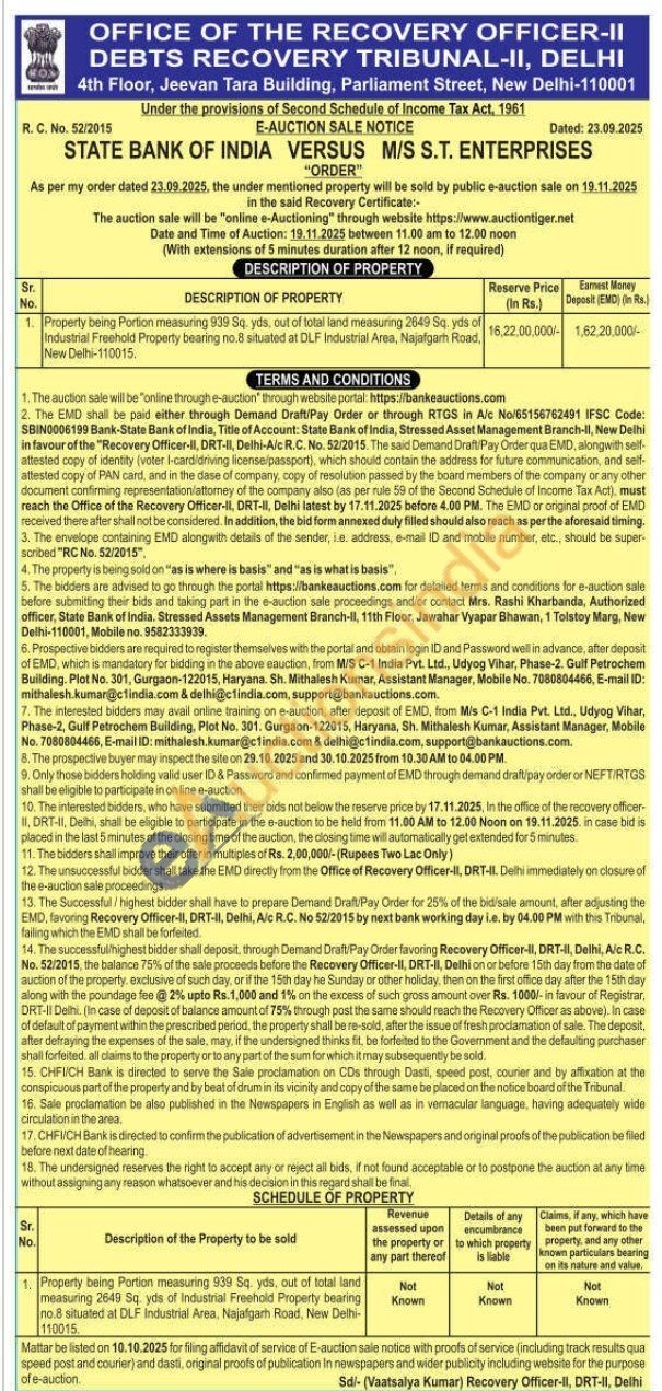 1. Property being Portion measuring 1939 Sq, yds, out of total land measuring 2649 Sq. yds of Industrial Freehold Property bearing no.8 situated at DLF Industrial Area, Najafgarh Road, New Delhi-110015.