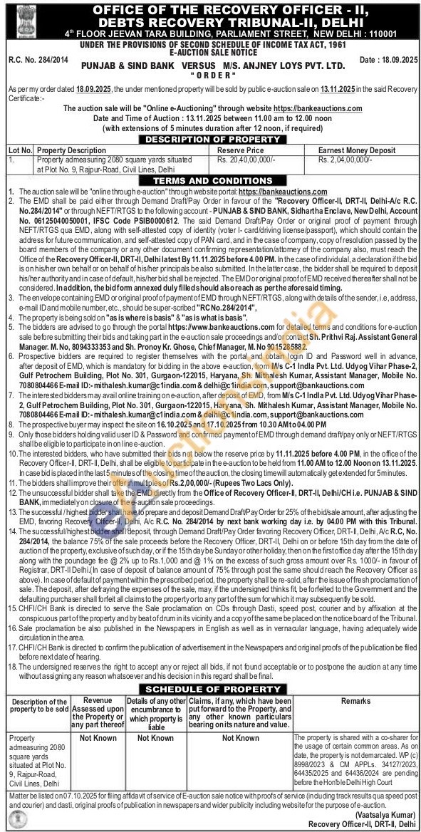 Property admeasuring 2080 square yards situated at Plot No. 9, Raipur-Road, Civil Lines, Delhi