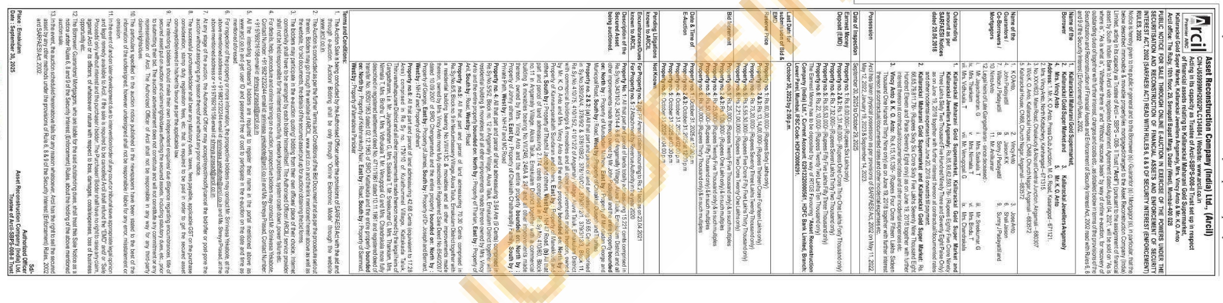 Property no.5: All that part and parcel of land admeasuring 70.30 Cents comprised in Re.Sy. No.6/5, Block no. 9 in Nedumbassery Village, Aluva Taluk, Emakulam District together with a residential building bearing No.VIII/413C & movables and all other improvements made thereon, owned by Mrs. Vincy Anto more fully described in Registered Sale Deed No.6540/2007 dated 10.09.2007 of SRO Chengamandu and the entire property bounded an: North by: Property of George, East by: Property of James, South by: Property of Dr. Joseph and Bemard, West by: NH 47 and Property of others"