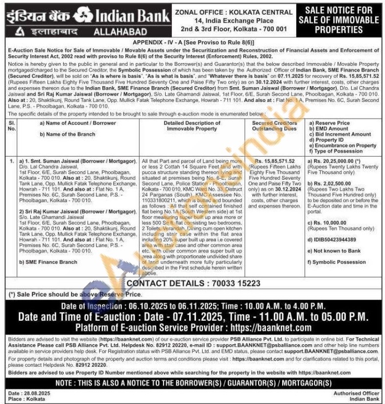 All that Part and parcel of Land being more or less 2 Cottah 14 Square Feet land with pucca structure standing thereon lying and situated at premises being No. 6-E, Surah Second Lane, Police Station - Phoolbagan, Kolkata-700 010, KMC Ward No. 33. Distruct 24 Parganas (South), KMC Assessee No. 110331800211, which is butted and bounded as follows: All that self contained finished flat being No. 1A (South Western side) at 1st floor measuring super built up area more or less 500 Sq.ft. flat consisting two bedrooms. 2 Toilets. Verandah, Dining cum open kitchen including stair case within the flat area including 20% super built up area ie covered area with stair case and other common area. etc, with other common area super built up area along with proportionate undivided share of land underneath more fully particularly described in the First schedule herein written above.
