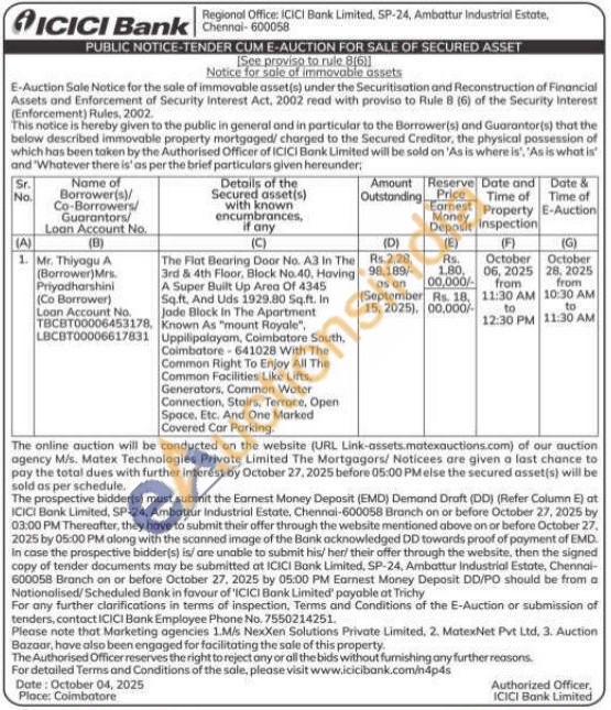 The Flat Bearing Door No. A3 In The 3rd & 4th Floor, Block No. 40, Having A Super Built Up Area Of 4345 Sq.ft, And Uds 1929.80 Sq.ft. In Jade Block In The Apartment Known As "mount Royale", Uppilipalayam, Coimbatore South, Coimbatore-641028 With The Common Right To Enjoy All The Common Facilities Like Lifts. Generators, Common Water Connection, Stairs, Terrace, Open Space, Etc. And One Marked Covered Car Parking.