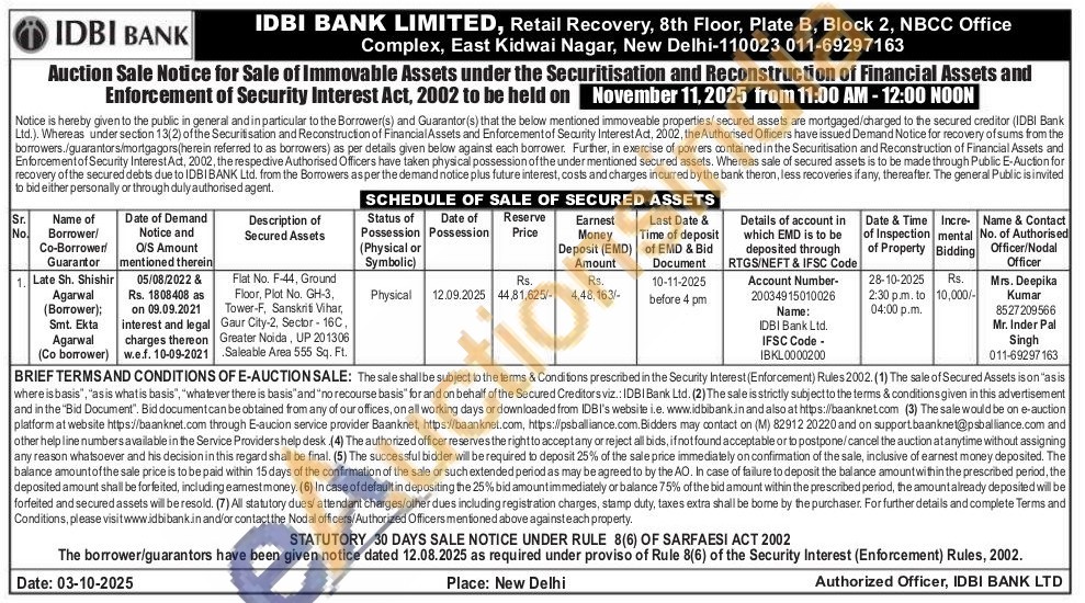 Flat No. F-44, Ground Floor, Plot No. GH-3, Tower-F, Sanskriti Vihar, Gaur City-2, Sector-160, Greater Noida, UP 201306 Saleable Area 555 Sq. Ft.