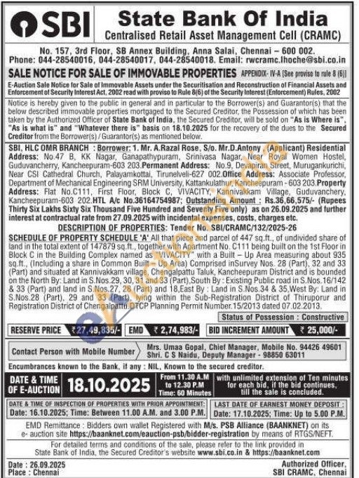 All that piece and parcel of 447 sq.ft., of undivided share of land in the total extent of 147879 sq.ft., together with Apartment No. C111 being built on the 1st Floor in Block C in the Building Complex named as "VIVACITY" with a Built-Up Area measuring about 935 sq.ft., (Including a share in Common Built-Up Area) Comprised inSurvey Nos. 28 (Part), 32 and 33 (Part) and situated at Kannivakkam village, Chengalpattu Taluk, Kancheepuram District and is bounded on the North By: Land in S.Nos 29, 30, 31 and 33 (Part), South By: Existing Public road in S.Nos. 16/142 & 33 (Part) and land in S.Nos.27, 28 (Part) and 18, East By: Land in S. Nos 34 & 35,West By: Land in S.Nos 28 (Part), 29 and 33 (Part), lying within the Sub-Registration District of Thiruporur and Registration District of Chengalpattu. DTCP Planning Permit Number. 15/2013 dated 07.02.2013