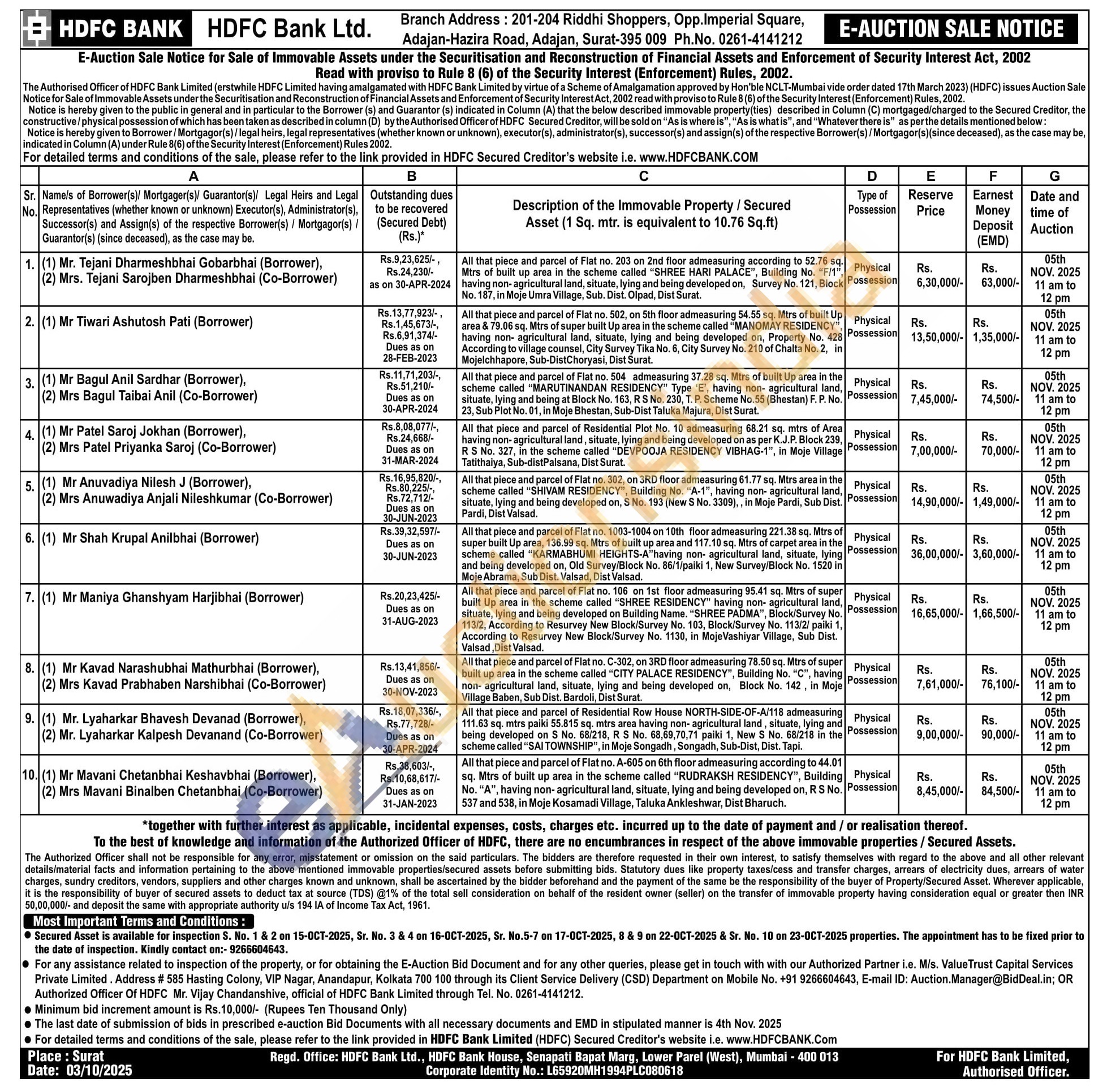 Contact Authorized Officer Of HDFC Mr. Vijay Chandanshive, official of HDFC Bank Limited through Tel. No. 0261-4141212