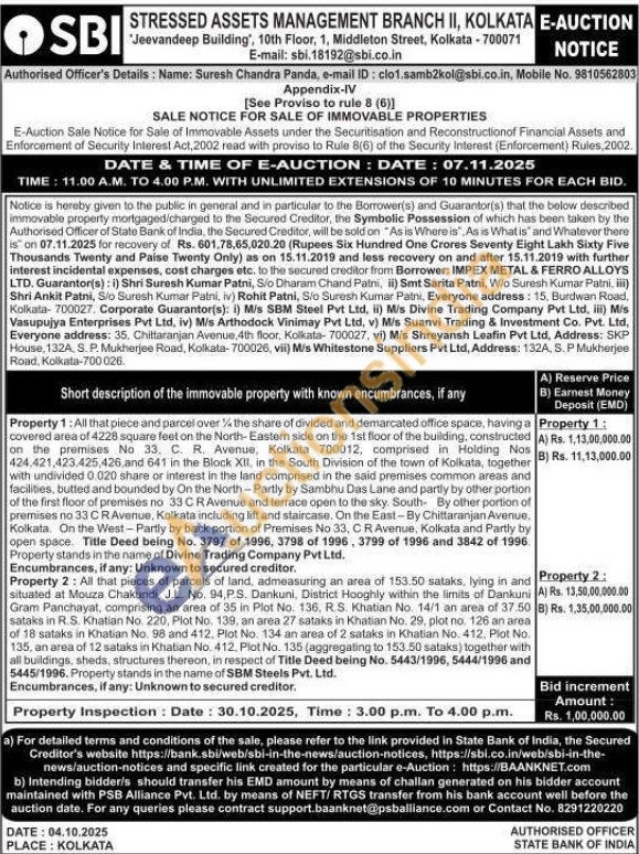 Property 2: All that pieces of parcels of land, admeasuring an area of 153.50 sataks, lying in and situated at Mouza Chakundi, J.L. No. 94,P.S. Dankuni, District Hooghly within the limits of Dankuni Gram Panchayat, comprising an area of 35 in Plot No. 136, RS. Khatian No. 14/1 an area of 37.50 sataks in R.S. Khatian No. 220, Plot No. 139, an area 27 sataks in Khatian No. 29, plot no. 126 an area of 18 sataks in Khatian No. 98 and 412, Plot No. 134 an area of 2 sataks in Khatian No. 412. Plot No. 135, an area of 12 sataks in Khatian No. 412, Plot No. 135 (aggregating to 153.50 sataks) together with all buildings, sheds, structures thereon, in respect of Title Deed being No. 5443/1996, 5444/1996 and 5445/1996. Property stands in the name of SBM Steels Pvt. Ltd