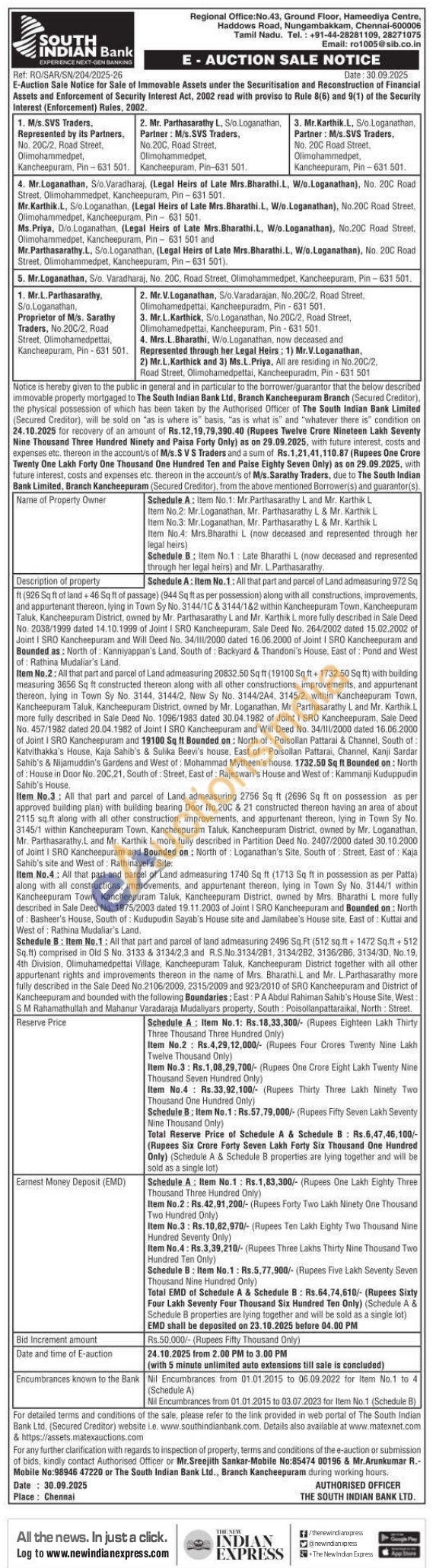 Item No.2: All that part and parcel of Land admeasuring 20832.50 Sq ft (19100 Sq ft + 1732.50 Sq ft) with building measuring 3656 Sq ft constructed thereon along with all other constructions, improvements, and appurtenant thereon, lying in Town Sy No. 3144, 3144/2, New Sy No. 3144/2A4, 3145/2, within Kancheepuram Town, Kancheepuram Taluk, Kancheepuram District, owned by Mr. Loganathan, Mr. Parthasarathy L and Mr. Karthik.L more fully described in Sale Deed No. 1096/1983 dated 30.04.1982 of Joint I SRO Kancheepuram, Sale Deed No. 457/1982 dated 20.04.1982 of Joint I SRO Kancheepuram and Will Deed No. 34/III/2000 dated 16.06.2000 of Joint I SRO Kancheepuram and 19100 Sq ft Bounded on: North of Poisollan Pattarai & Channel, South of: Katvithakka's House, Kaja Sahib's & Sulika Beevi's house. East of Poisollan Pattarai, Channel, Kanji Sardar Sahib's & Nijamuddin's Gardens and West of: Mohammad Mytheen's house. 1732.50 Sq ft Bounded on: North of: House in Door No. 200,21, South of: Street, East of: Rajeswari's House and West of: Kammanji Kuduppudin Sahib's House