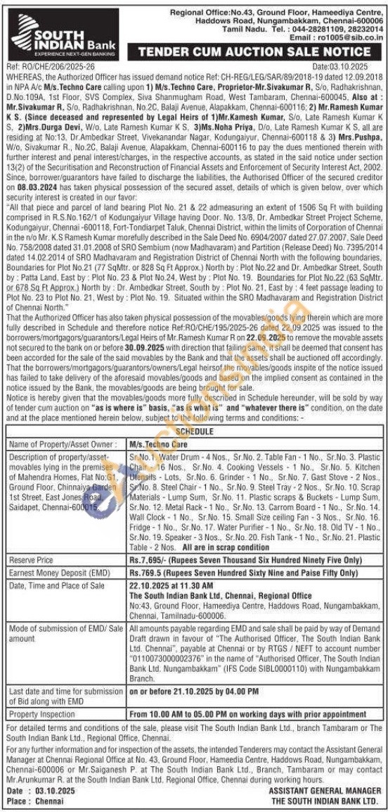 Sr.No.1. Water Drum-4 Nos., Sr.No. 2. Table Fan-1 No., Sr.No. 3. Plastic Chair 16 Nos, Sr.No. 4. Cooking Vessels 1 No, Sr.No. 5. Kitchen Utensils Lots, Sr.No. 6. Grinder-1 No. Sr. No. 7. Gast Stove-2 Nos.... Sr.No. 8. Steel Chair-1 No., Sr.No. 9. Steel Tray-2 Nos., Sr.No. 10. Scrap Materials-Lump Sum, Sr. No. 11. Plastic scraps & Buckets-Lump Sum Sr.No. 12. Metal Rack-1 No., Sr.No. 13. Carrom Board-1 No., Sr.No. 14. Wall Clock 1 No, Sr.No. 15. Small Size ceiling Fan-3 Nos., Sr.No. 16. Fridge-1 No., Sr.No. 17. Water Purifier-1 No, Sr.No. 18. Old TV-1 No.. Sr.No. 19. Speaker-3 Nos.. Sr.No. 20. Fish Tank-1 No, Sr. No. 21. Plastic Table-2 Nos. All are in scrap condition