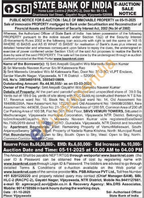 Details of Property: All the part and parcelof undivided and unspecified share of 39.0 Sq. Yards out of 189.0 Sq. yards of site along with RCC building constructed thereon NTS No: 17. Revenue ward No: 16, Block No: 8, Muncipal ward No: 14. Old Assesment No: 184898/209A, New Assesment No: 172250. and Old Assesment No: 184898/2058/1, New Assesment No: 445636, Door No: 21-15-17, Plinth Area of 1200 Sft, Common Area of 200 sft Car Parking Area of 100 Sft, Flat No: 301 Third Floor, SBVS VEMURI TOWERS, Sittuated in Madhuranagar, Vijayawada municipal Corporation, Vijayawada NTR District. Belonging toSmtArepalliGayathri W/o Mareedu Naveen Kumar vide registeredSaleDeed No.7505/2019 dated 18.10.2019 JSRO, Gunadala, Vijayawada, NTR District and bounded by: Apartment Boundaries: East: Remaining Property of VemuriMalleswari, South Anjaneya Swamy Temple, West: Property of Nadella Rama Krishna, North: Muncipal Road. Flat Boundaries: East: Open to Sky, South: Open to Sky, West: Open to Sky, North Common Corridor and Stair Case