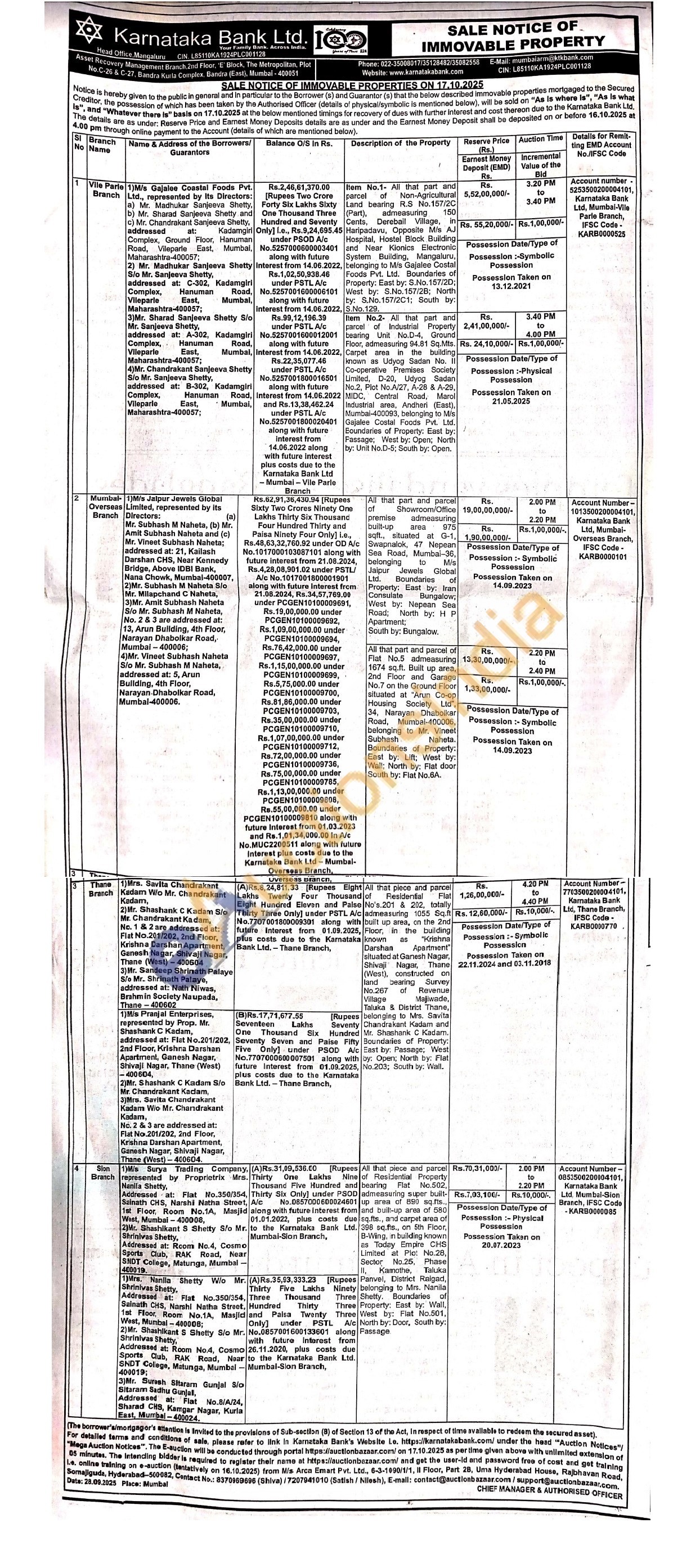 Item No.1- All that part and parcel of Non-Agricultural Land bearing R.S No.157/20 (Part), admeasuring 150 Cents, Derebail Village, in Haripadavu, Opposite M/s AJ Costal Hospital, Hostel Block Building and Near Kionics Electronic System Building, Mangaluru, belonging to M/s Gajalee Costal Foods Pvt. Ltd. Boundaries of Property: East by: S.No. 157/2D; West by: S.No. 157/28; North ty: S.No.157/2C1; South by: S.No.129.