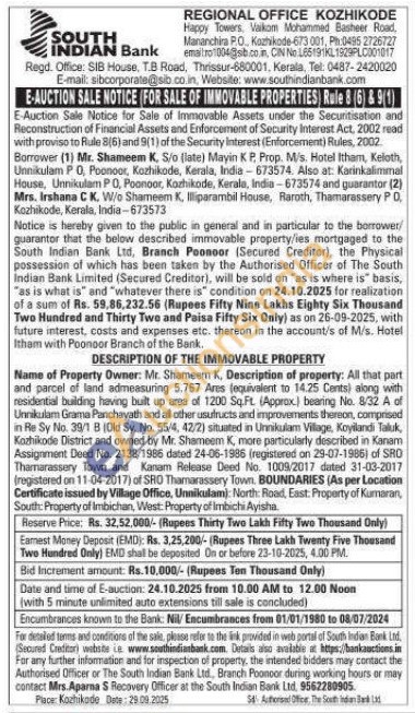 Name of Property Owner: Mr. Shameem K. Description of property: All that part and parcel of land admeasuring 5.767 Ares (equivalent to 14.25 Cents) along with residential building having built up area of 1200 Sq.Ft. (Approx) bearing No. 8/32 A of Unnikulam Grama Panchayath and all other usufructs and improvements thereon, comprised in Re Sy No. 39/1 B (Old Sy. No. 55/4, 42/2) situated in Unnikulam Village, Koyilandi Taluk, Kozhikode District and owned by Mr. Shameem K, more particularly described in Kanam Assignment Deed No. 2138/1986 dated 24-06-1986 (registered on 29-07-1986) of SRO Thamarassery Town and Kanam Release Deed No. 1009/2017 dated 31-03-2017 (registered on 11-04-2017) of SRO Thamarassery Town, BOUNDARIES (As per Location Certificate issued by Village Office, Unnikulam): North Road, East: Property of Kumaran, South: Property of Imbichan, West: Property of Imbichi Ayisha