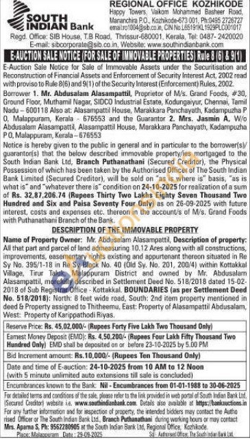 Name of Property Owner: Mr. Abdusalam Alasampattil, Description of property: All that part and parcel of land admeasuring 10.12 Ares along with all constructions, improvements, easementary rights existing and appurtenant thereon situated in Re Sy No. 395/1-18 in Re Sy Block No. 40 (Old Sy. No. 201, 200/4) within Kottakkal Village, Tirur Taluk, Malappuram District and owned by Mr. Abdusalam Alasampattil, morefully described in Settlement Deed No. 518/2018 dated 15-02-2018 of Sub Registrar Office-Kottakkal. BOUNDARIES (as per Settlement Deed No. 518/2018): North: 8 feet wide road, South: 2nd item property mentioned in deed & Property assigned to Thitheemu, East: Property of Alasampattil Abdusalam, West: Property of Karippathodi Riyas