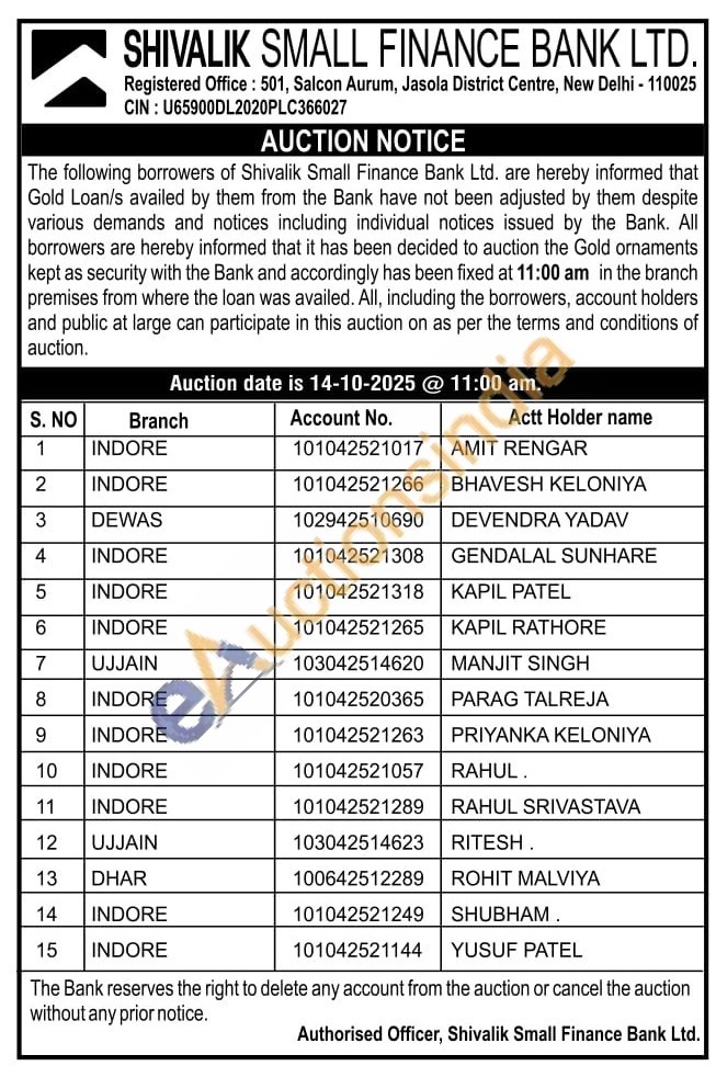 Shivalik Small Finance Bank Ltd Gold Auctions Auction in Indore