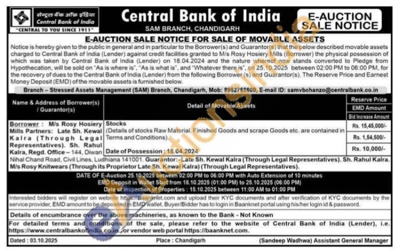 Contact Branch-Stressed Assets Management (SAM) Branch, Chandigarh, Mob: 9982768600, E-mail ID: samvbchanzo@centralbank.co.in