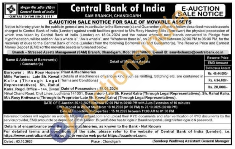 Contact Branch-Stressed Assets Management (SAM) Branch, Chandigarh, Mob: 9982768600, E-mail ID: samvbchanzo@centralbank.co.in