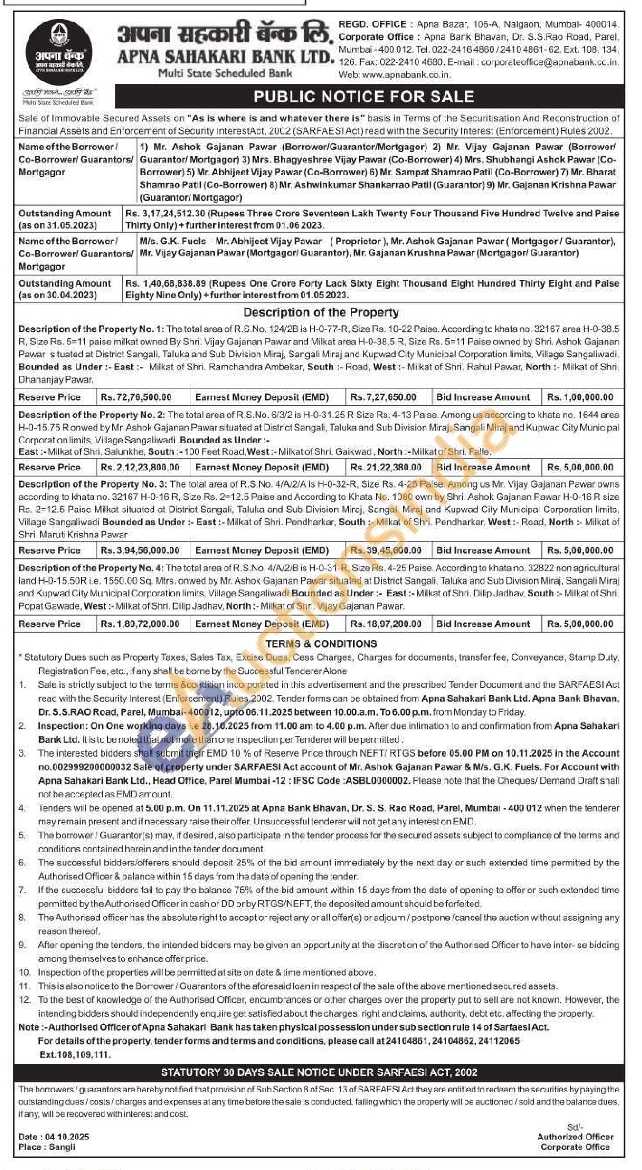 Property No. 3: The total area of R.S.No. 4/A/2/A is H-0-32-R, Size Rs. 4-25 Paise. Among us Mr. Vijay Gajanan Pawar owns according to khata no. 32167 H-0-16 R, Size Rs. 2-12.5 Paise and According to Khata No. 1080 own by Shri. Ashok Gajanan Pawar H-0-16 R size Rs. 2-12.5 Paise Milkat situated at District Sangali, Taluka and Sub Division Miraj, Sangali Miraj and Kupwad City Municipal Corporation limits, Village Sangaliwadi Bounded as Under: East:-Milkat of Shri. Pendharkar, South: Milkat of Shri. Pendharkar, West :- Road, North :- Milkat of Shri. Maruti Krishna Pawar