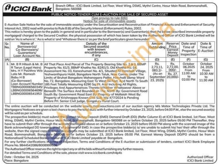 All That Piece And Parcel of The Property Bearing Site No. 2 & 3, BBMP Property No. 61/3, BBMP Khatha No. 82/61/3. Old Khatha No. 04, Assessment No. 03, Kaneshumari No. 4/1, Situated At Herohalli Village, Yeshwanthpura Habli, Bangalore North Taluk, Now Comes Under The Limits of Bruhat Bangalore Mahanagara Palike, Herohalli Bbmp Ward No. 72. Bangalore, Measuring East To West 34 Feet, And North To South 185 Feet Totally Measuring 6290 Sq. Ft. And including All Rights, / Privileges And Appurtenances Thereto Whether Whatsoever Above or Beneath The Surface And Bounded on The North By: Government Road South By: Government Road East By: Property of Mallalah West By: Property of Krishnappa Known Civil Suit: Wp 477/2024 Is Pending Before Pri. Senior Civil Judge, Bengaluru Rural Court