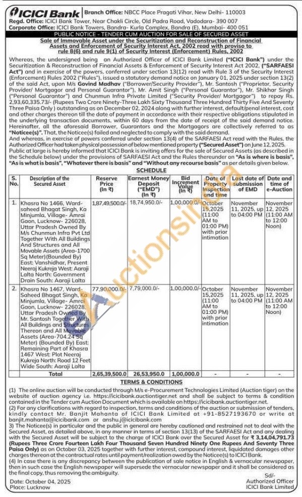 Khasra No 1466, Ward saheed Bhagat Singh, Ka Minjumla, Village- Amrai Goon, Lucknow-226028, Uttar Pradesh Owned By M/s Chunmun Infra Pvt Ltd Together With All Buildings And Structures and All Movable Assets (Area-1700 Sq Meter) (Bounded By) East: Vanshidhar, Present Neeraj Kukreja West: Aaraji Lalta North: Government Drain South: Aaraji Lalta