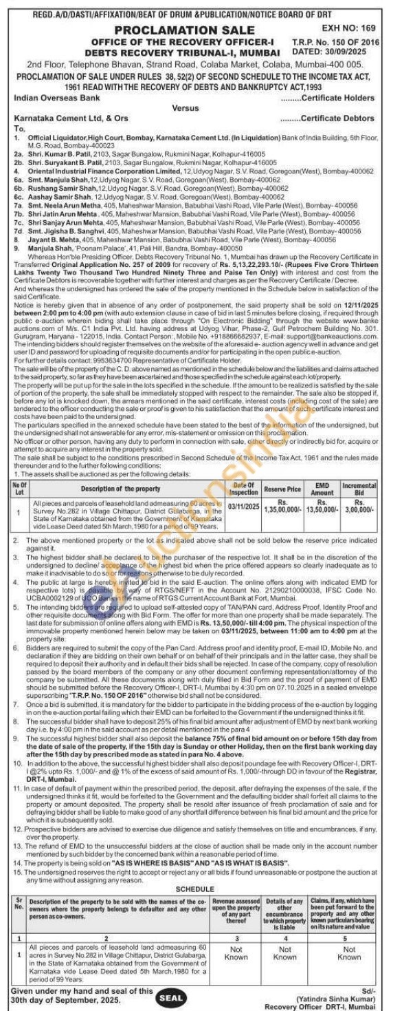 All pieces and parcels of leasehold land admeasuring 60 acres in Survey No.282 in Village Chittapur, District Gulabarga, in the State of Karnataka obtained from the Government of Karnataka vide Lease Deed dated 5th March, 1980 for a period of 99 Years