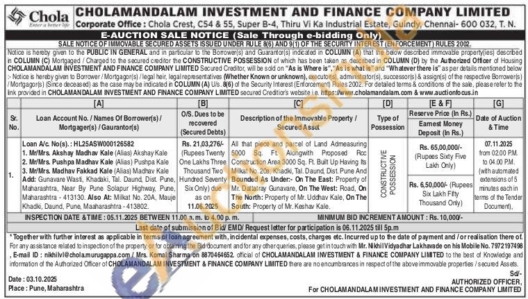All that piece and parcel of Land Admeasuring 5000 Sq. Ft. Alongwith Proposed Roc Construction Area 3000 Sq. Ft. Built Up Having Its Milkat No.20a, Khadki, Tal. Daund, Dist. Pune And Bounded As Under: On The East: Property of Mr. Dattatray Gunavare, On The West: Road, On The North: Property of Mr. Uddhav Kale, On The South: Property of Mr. Keshav Kale