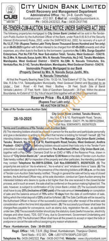 Immovable Property Mortgaged to our Bank (Property Owned by Mrs. N. Navudu Surya Jyothi, W/o. N. Navudu Trimurtulu) : All that the Property Bearing Near D.No. 10-32-1A, Total Extent of 121 Sq. Yards. of Vacant Site, R.S.No.1/1A, Tadepalligudem Municipality, West Godavari District and Bounded by as Under: East: Road 40 Feet, West Bodhey 39 Feet, South Site of Bandi Venkata Lakshmi-27 Feet, North Side of Gandham Satyavathi - 28 Feet. Within the above Boundaries, An Extent of 121 Sq. Yds of Vacant Site together with all Other Easement etc