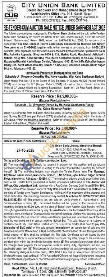 Immovable Properties Mortgaged to our Bank : Schedule-A: (Property Owned by Mrs. Kalva Navatha, W/o. Kalva Seetharam Reddy) : Open House Plot No. 44 to an Extent of 200 Sq.yards, in Survey No.325 (As per Pahani 325/1) and Survey No.327 (As per Pahani 327/1) situated at Jaipur Shivar, within the limits of GP Jaipur Within the following Boundaries: North of 30 Feet Road, South of: Plot No.43, East of: 25 Feet Road, West of: Plot No.53