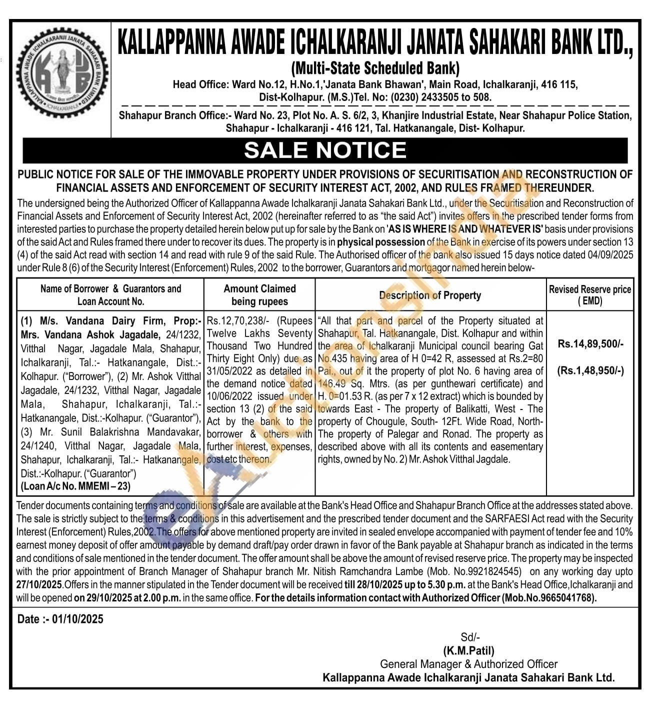 "All that part and parcel of the Property situated at Shahapur, Tal. Hatkanangale, Dist. Kolhapur and within the area of Ichalkaranji Municipal council bearing Gat No.435 having area of H 0=42 R, assessed at Rs.2=80 Pai., out of it the property of plot No. 6 having area of 146.49 Sq. Mtrs. (as per gunthewari certificate) and H. 0=01.53 R. (as per 7 x 12 extract) which is bounded by towards East The property of Balikatti, West - The property of Chougule, South- 12Ft. Wide Road, North-The property of Palegar and Ronad. The property as described above with all its contents and easementary rights, owned by No. 2) Mr. Ashok Vitthal Jagdale.