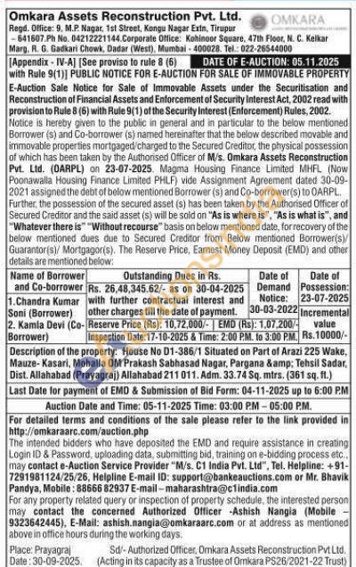 House No D1-386/1 Situated on Part of Arazi 225 Wake, Mauze-Kasari, Mohalla OM Prakash Sabhasad Nagar, Pargana & Tehsil Sadar, Dist. Allahabad (Prayagraj) Allahabad 211 011. Adm. 33.74 Sq. mtrs. (361 sq. ft.)