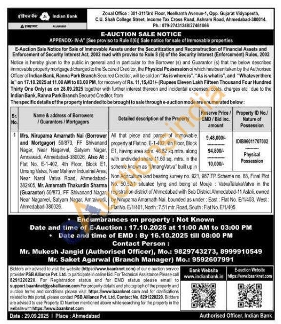 All that piece and parcel of immovable property at Flat no. E-1-402, 4th Floor, Block E1, having area adm. 46.82 sq.mtrs. along with undivided share 11.60 sq. mtrs. in the scheme known as "Umang Vatva" built up in Non Agriculture land bearing survey no. 921, 987 TP Scheme no. 88, Final Plot No. 50,52/1 situated lying and being at Mouje: Vatva TalukaVatva in the registration district of Ahmedabad with Sub District Ahmedabad-11 Aslali. owned by Nirupama Amarnath Nai. bounded as under: East: Flat No. E/1/403, West: Flat No. E/1/401, North: 7.51 mtr. Road, South: Flat No. E/1/405