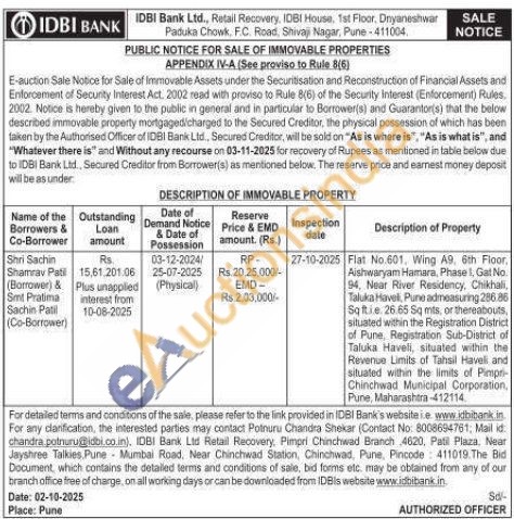 Flat No.601, Wing A9, 6th Floor, Aishwaryam Hamara, Phase 1, Gat No. 94, Near River Residency, Chikhali, Taluka Haveli, Pune admeasuring 286.86 Sqftie. 26.65 Sq mts, or thereabouts, situated within the Registration District of Pune, Registration Sub-District of Taluka Haveli, situated within the Revenue Limits of Tahsil Haveli and situated within the limits of Pimpri Chinchwad Municipal Corporation, Pune, Maharashtra-412114