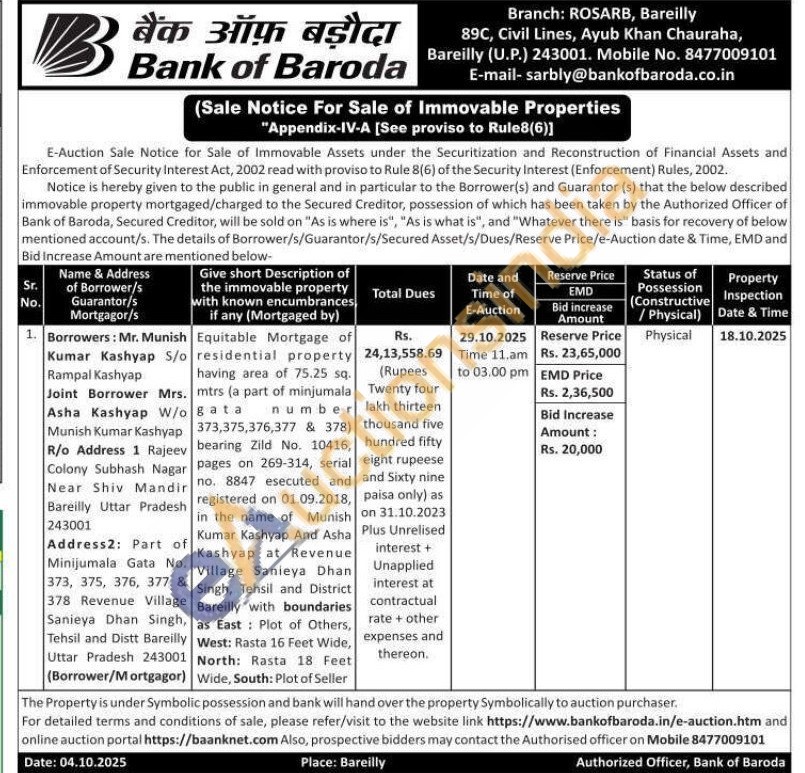 Equitable Mortgage of residential property having area of 75.25 sq. mtrs (a part of minjumala gata number 373,375,376,377 & 378) bearing Zild No. 10416, pages on 269-314, serial no. 8847 esecuted and registered on 01.09.2018, in the name of Munish Kumar Kashyap And Asha Kashyap at Revenue Village Sanieya Dhan Singh, Tehsil and District Bareilly with boundaries as East Plot of Others, West: Rasta 16 Feet Wide, North: Rasta 18 Feet Wide, South: Plot of Seller
