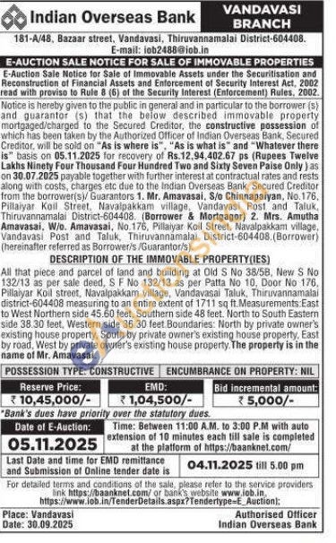 All that piece and parcel of land and building at Old S No 38/58, New S No 132/13 as per sale deed, SF No 132/13 as per Patta No 10, Door No 176, Pillaiyar Koil street, Navalpakkam village, Vandavasai Taluk, Thiruvannamalai district-604408 measuring to an entire extent of 1711 sq ft. Measurements:East to West Northern side 45.60 feet, Southern side 48 feet. North to South Eastern side 38.30 feet, Western side 36.30 feet Boundaries: North by private owner's existing house property, South by private owner's existing house property, East by road, West by private owner's existing house property. The property is in the name of Mr. Amavasai.