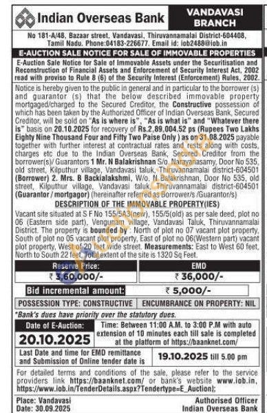Vacant site situated at SF No 155/5A3(new), 155/5(old) as per sale deed, plot no 06 (Eastern side part), Vengunam village, Vandavasi Taluk, Thiruvannamalai District. The property is bounded by North of plot no 07 vacant plot property, South of plot no 05 vacant plot property, East of plot no 06(Western part) vacant plot property, West of 20 feet wide street. Measurements: East to West 60 feet, North to South 22 feet, Total extent of the site is 1320 Sq Feet.