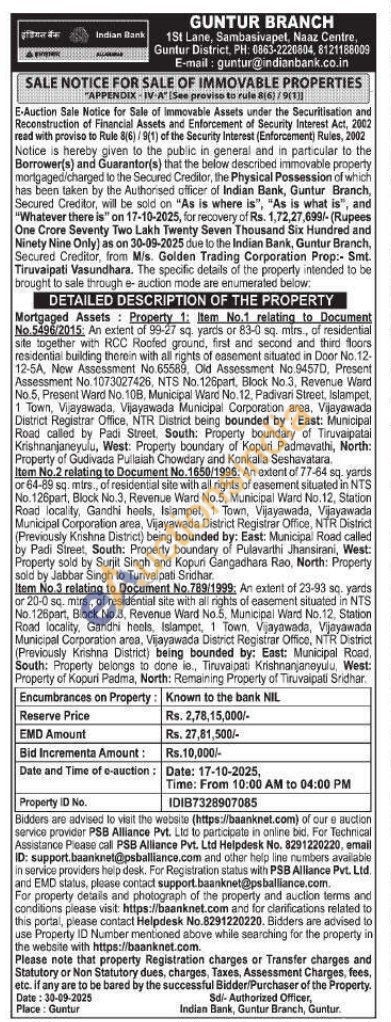 An extent of 99-27 sq yards or 83-0 sq. mirs., of residential site together with RCC Roofed ground, first and second and third floors residential building therein with all rights of easement situated in Door No. 12-12-5A, New Assessment No 65589, Old Assessment No.9457D, Present Assessment No. 1073027426, NTS No. 126part, Block No.3, Revenue Ward No.5, Present Ward No. 10B, Municipal Ward No. 12. Padivani Street, Islampet, 1 Town, Vijayawada, Vijayawada Municipal Corporation area, Vijayawada District Registrar Office, NTR District being bounded by: East: Municipal Road called by Padi Street, South: Property boundary of Tiruvaipatal Krishnanjaneyulu, West: Property boundary of Kopuri Padmavathi, North: Property of Gudivada Pullaiah Chowdary and Konkalla Seshavatara,