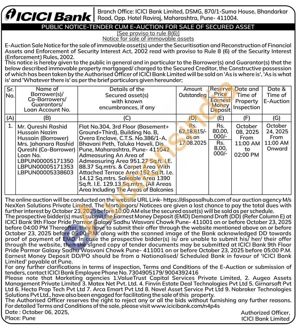 Flat No.304, 3rd Floor (Basement+ Ground+Third), Building No. B, Overa Enclave, C.T.S. No.386/1-A, Bhavani Peth, Taluka Haveli, Dis Pune, Maharashtra, Pune-411042 Admeasuring An Area of Admeasuring Area 951.27 Sq.ft. I.Ε. 88.37 Sq.mtrs. & Carpet Area With Attached Terrace Area 152 Sq.ft. l.e. 14.12 Sq.mtrs. Saleable Area 1390 Sq.ft. I.E. 129.13 Sq.mtrs. (All Areas Area Including The Areas of Balconies