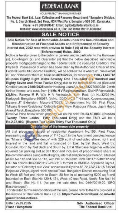 All that piece and parcel of residential Apartment No.105. First Floor, measuring super built up area of 1145 sq.ft in the Apartment complex known as "Miyans Green Residency with 229 sq.ft of undivided share, right and Interest in the land and flat is bounded on East by:Set Back, West by: Corridor, North by: Set Back and South by: Lift & Staircase together with one covered car parking slot at Stilt floor and inclusive of proportionate share in the common areas along with all rights, interest and privileges thereon, situated at site No. 112 and Site no. 113, with PID no 150200103200201171/240/112 and PID No. 150200103200201172/240/113 formed in BMRDA Approved layout, situated at "Celebrity Lake View carved out in Sy Nos 56,72,73/2,74/1,874/2 of Rajapura Village, Jigani Hobli, Anekal Taluk, Bangalore District, measuring East to West: 65 feet and North to South: 80 feet in all measuring 5200 sq ft and bounded on East: Site No. 120 & 121, West: 40 feet Road, North: Site No. 114 and South: Site No.111. (As per the sale deed No. 10494/2019-20, SRO