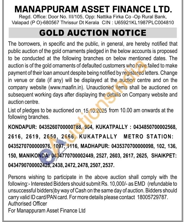 Manappuram Asset Finance Ltd Gold Auctions Auction in Thrissur