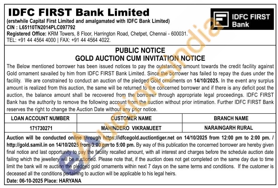 IDFC First Bank Ltd Gold Auctions Auction in Chennai