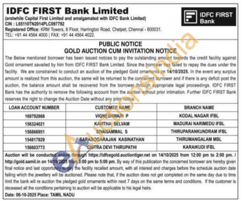 IDFC First Bank Ltd Gold Auctions Auction in Karaikudi