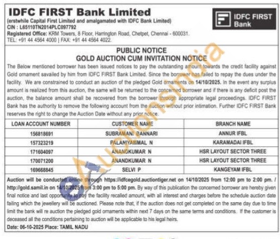 IDFC First Bank Ltd Gold Auctions Auction in Chennai