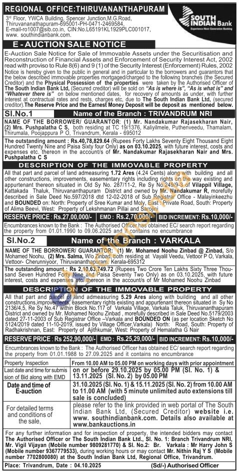 Contact Authorised Officer Br. Varkala: Mr Harry John S (Mobile number 9367779533)