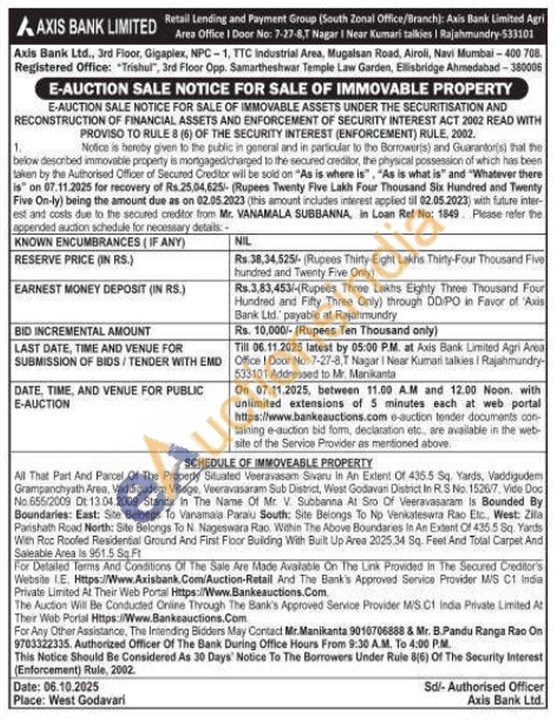 All That Part And Parcel Of The Property Situated Veeravasam Sivaru In An Extent Of 435.5 Sq. Yards, Vaddigudem Grampanchyath Area, Vaddigudem Village, Veeravasaram Sub District, West Godavari District In R.S No. 1526/7, Vide Doc No. 655/2009 Dt: 13.04.2009 Stands In The Name Of Mr. V. Subbanna At Sro Of Veeravasaram Is Bounded By Boundaries: East: Site Belongs To Vanamala Paralu South: Site Belongs To Np Venkateswra Rao Etc., West: Zila Parishath Road North: Site Belongs To N. Nageswara Rao. Within The Above Boundaries In An Extent Of 435.5 Sq. Yards With Roc Roofed Residential Ground And First Floor Building With Built Up Area 2025.34 Sq. Feet And Total Carpet And Saleable Area is 951.5 Sq. Ft