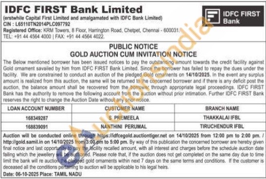 IDFC First Bank Ltd Gold Auctions Auction in Chennai